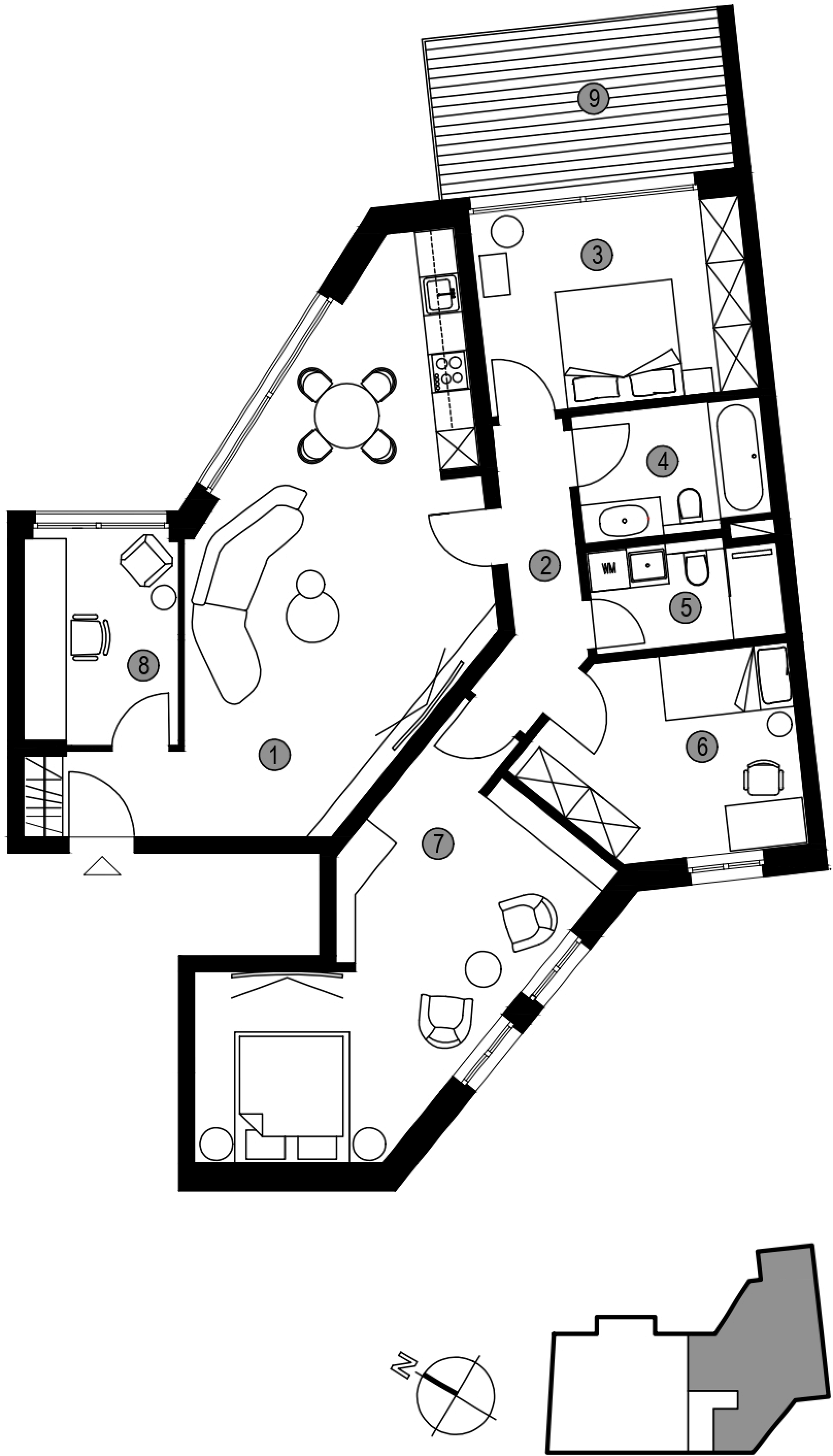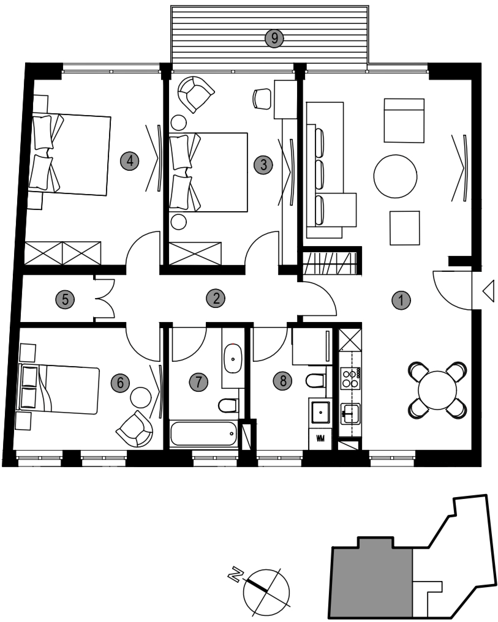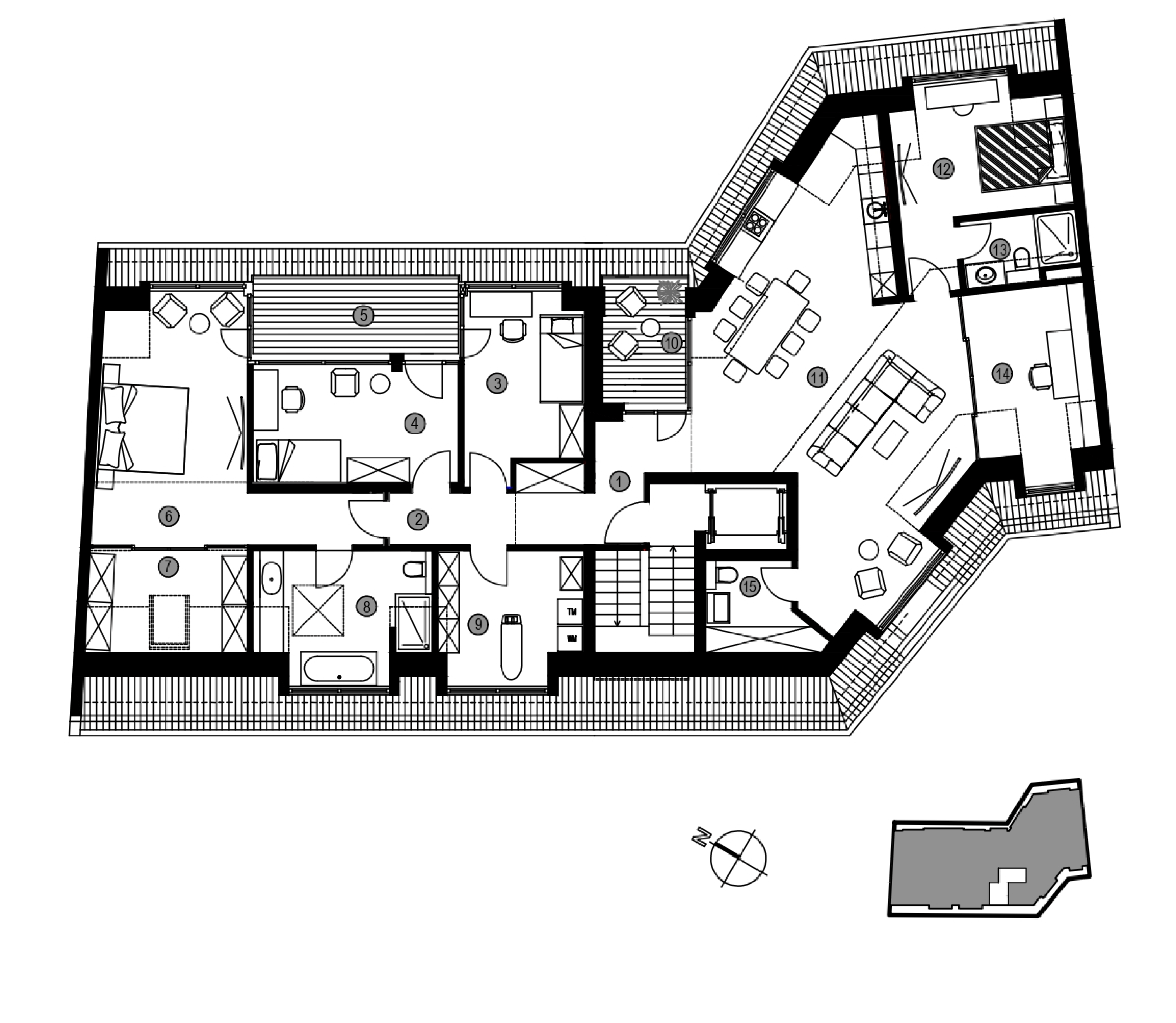 Die größte Wohnung bietet großzügige 190 m² Gesamtnutzfläche, aufgeteilt in 6 Räume: Küche, Gäste-WC, Master-Badezimmer und einen großzügigen Balkon. Alle Wohnungen verfügen über geräumige Terrassen, die nach Norden und Westen ausgerichtet sind.
