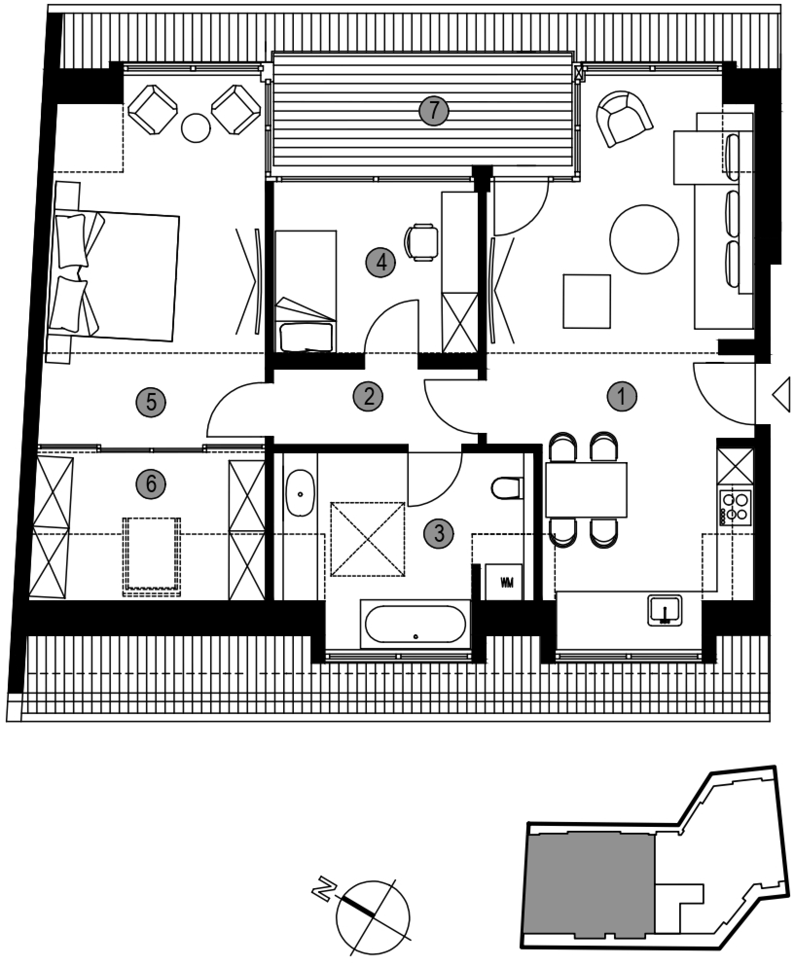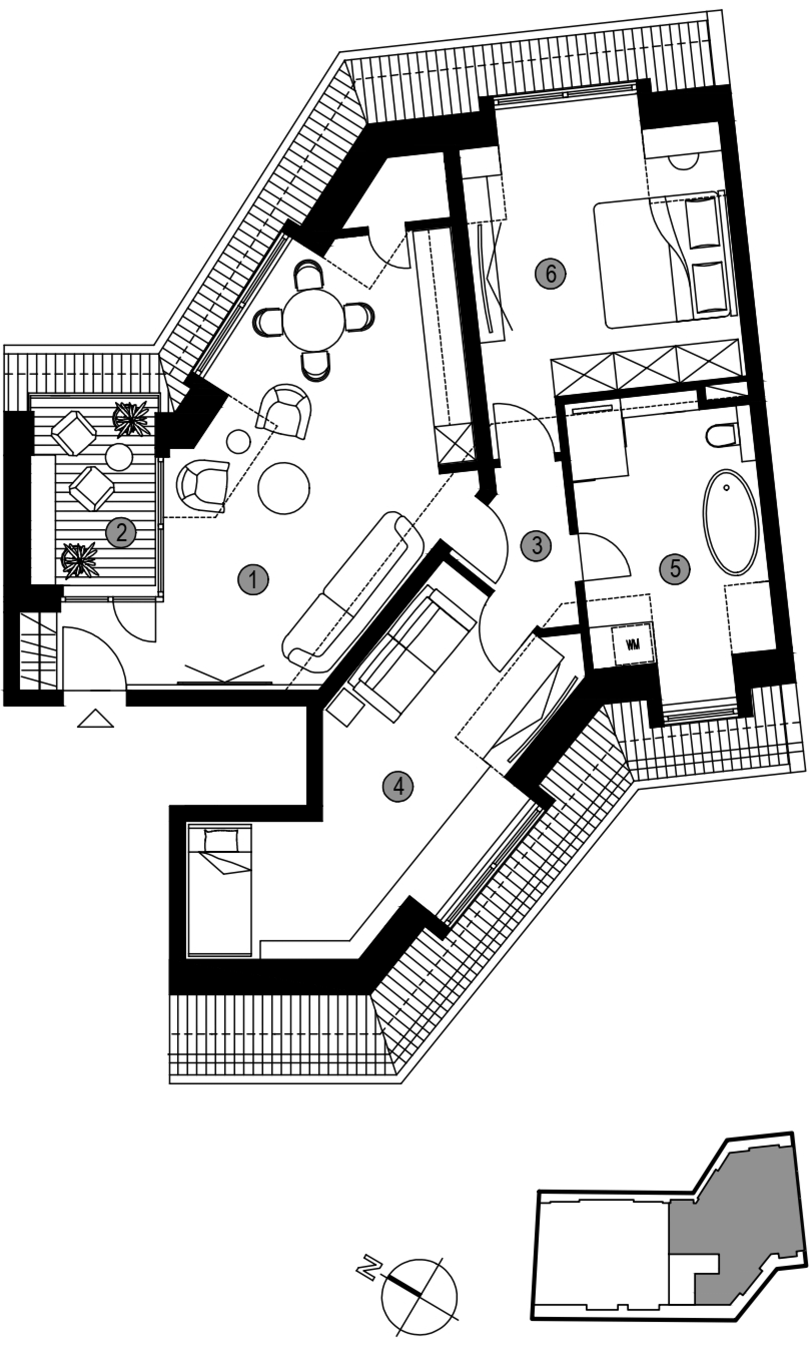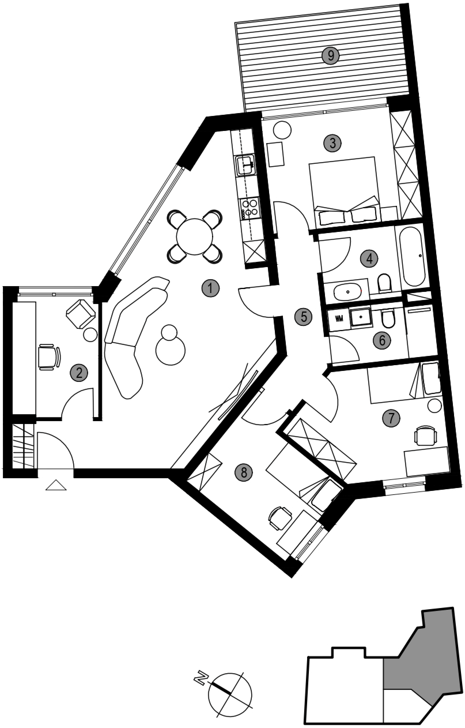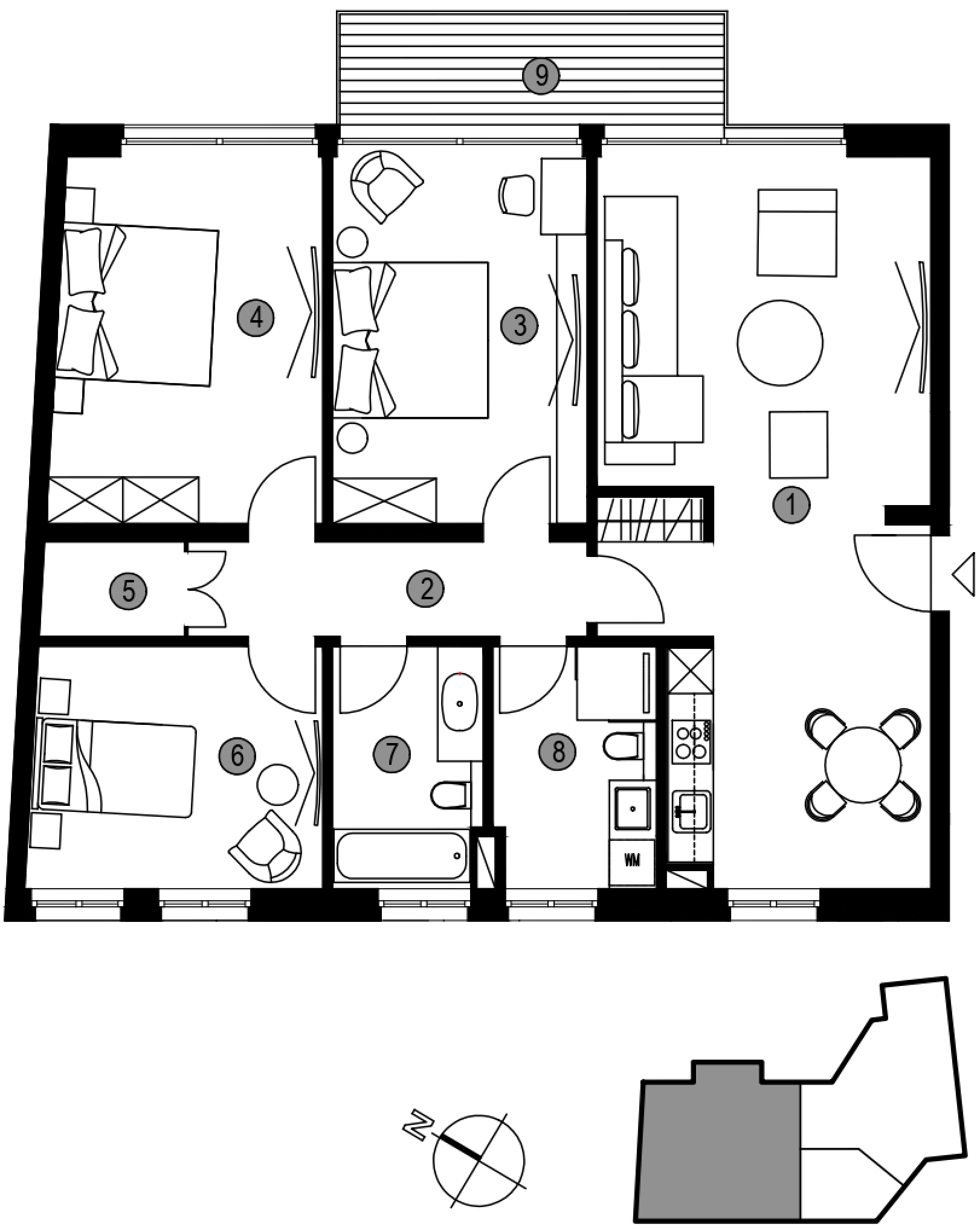 Die größte Wohnung bietet großzügige 190 m² Gesamtnutzfläche, aufgeteilt in 6 Räume: Küche, Gäste-WC, Master-Badezimmer und einen großzügigen Balkon. Alle Wohnungen verfügen über geräumige Terrassen, die nach Norden und Westen ausgerichtet sind.